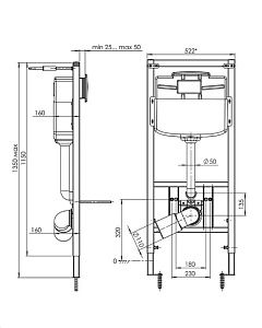 Металлическая рама с крепежом, смывной бачок, клавиша WP1430, переходные трубки, заглушки для труб 50 и 110 мм, картонная упаковка, паспорт с инструкцией.