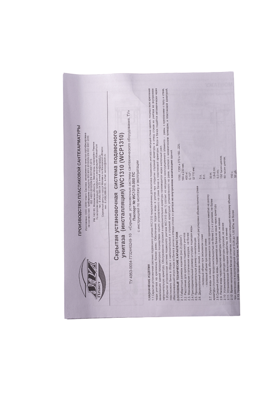 Комплектация:металлическая рама с нижними и верхними крепёжными элементами; комплект крепления инсталляции; заглушка для трубы 50 мм; заглушка для трубы 110 мм; картонный короб; паспорт с инструкцией по монтажу и эксплуатации.