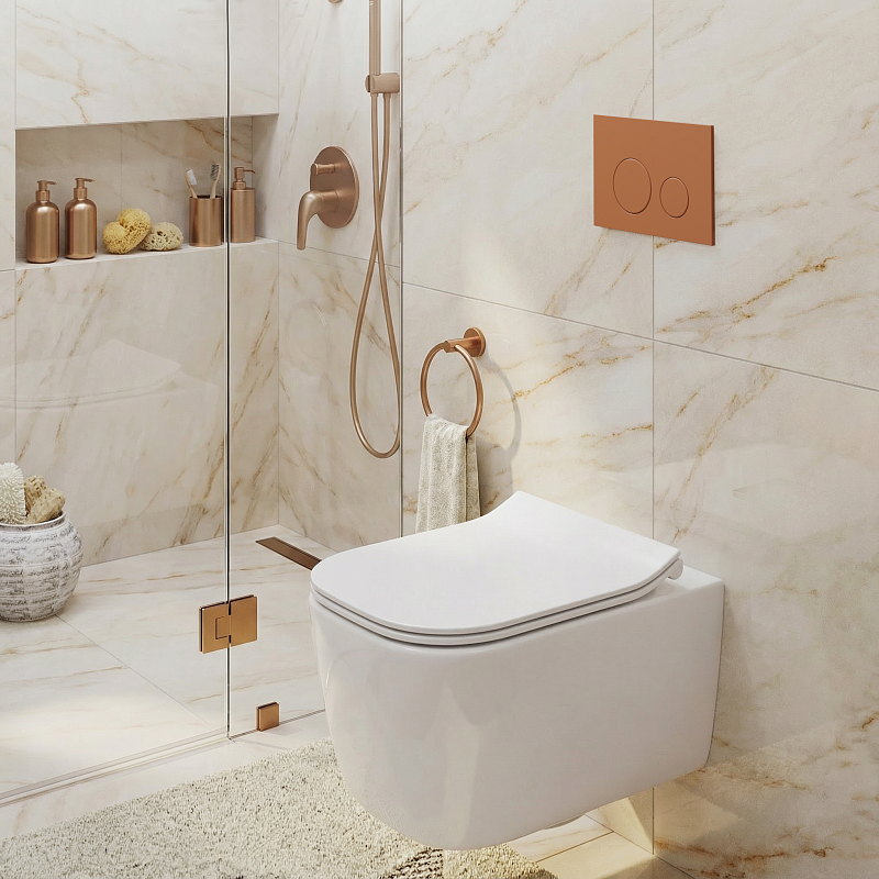 Оттенок медь матовая — это насыщенный, приглушённый металлический тон, который смотрится глубоко и утончённо. Матовое покрытие снижает отражения и блики, создаёт визуальную мягкость поверхности и делает цвет более ровным и благородным. Такая клавиша прекрасно вписывается в интерьеры с теплыми или нейтральными оттенками, а также выгодно смотрится в контрасте со светлой или тёмной плиткой, подчёркивая стильность и продуманность дизайна.