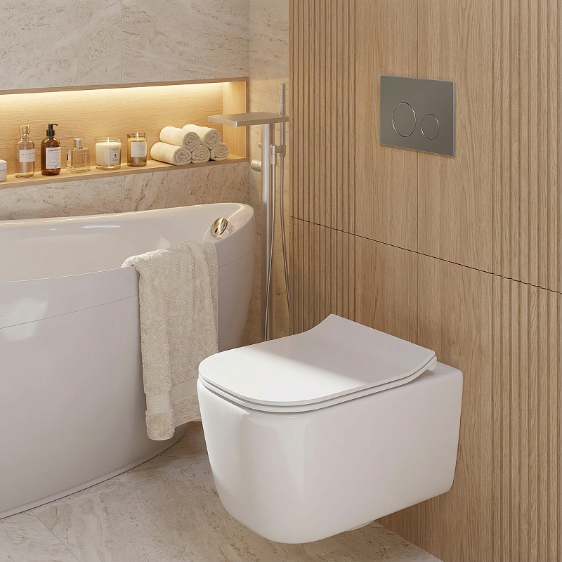Материалы изготовления клавиши подобраны с учётом условий ванной комнаты. Прочный пластик устойчив к влаге, температурным перепадам и бытовой химии, а матовая поверхность меньше подвержена видимым следам от касаний. Механизм нажатия — плавный, отзывчивый и долговечный, рассчитанный на многократные циклы без ухудшения качества работы.