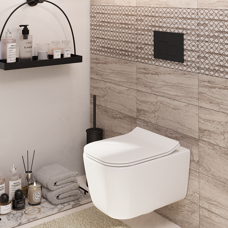 Чёрный матовый цвет придаёт клавише аккуратный, сдержанный, современный характер. Такая отделка отлично сочетается с контрастной плиткой, металлическими или стеклянными аксессуарами, тёмными поверхностями — она добавляет глубины и подчёркивает минимализм обстановки. Матовое покрытие снижает блики и делает панель визуально «спокойной» и дорого выглядящей.