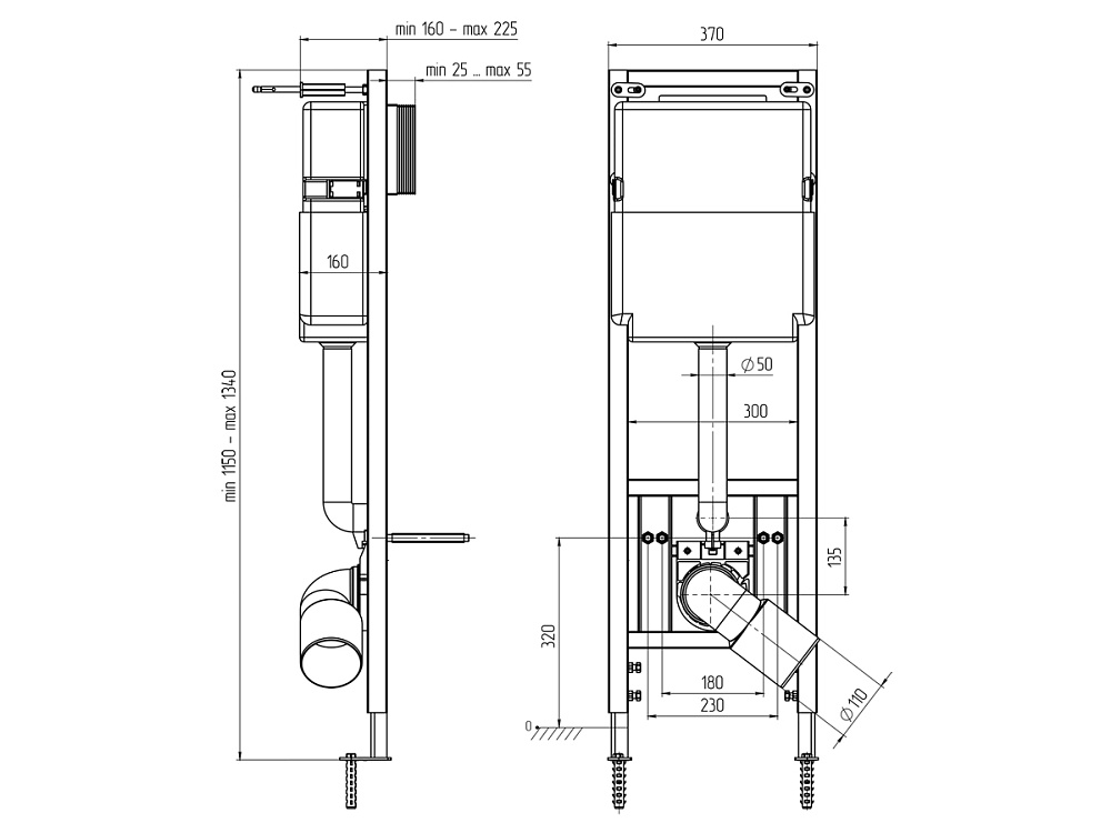 - Размеры инсталляции (ВхШхГ) мм - 1150–1350 (регулируемая) х 370 х 160-225 (регулируемая).