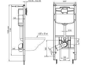 - Размеры инсталляции (В х Ш х Г): 1150–1350 мм (регулируемая высота) х 522 мм х 160–225 мм (регулируемая глубина).