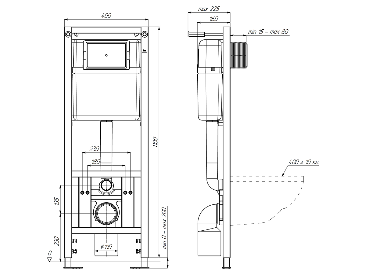 - Размеры инсталляции (В х Ш х Г): 1150–1350 мм (регулируемая высота) х 400 мм х 160–225 мм (регулируемая глубина).