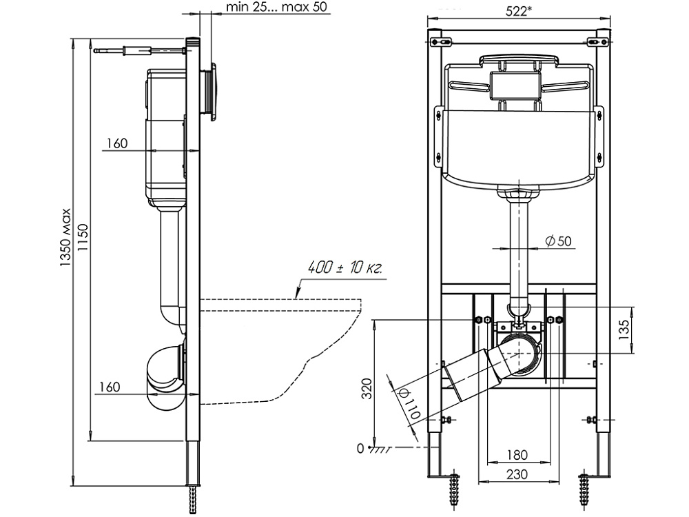 - Размеры инсталляции (В х Ш х Г): 1150–1350 мм (регулируемая высота) х 522 мм х 160–225 мм (регулируемая глубина).
