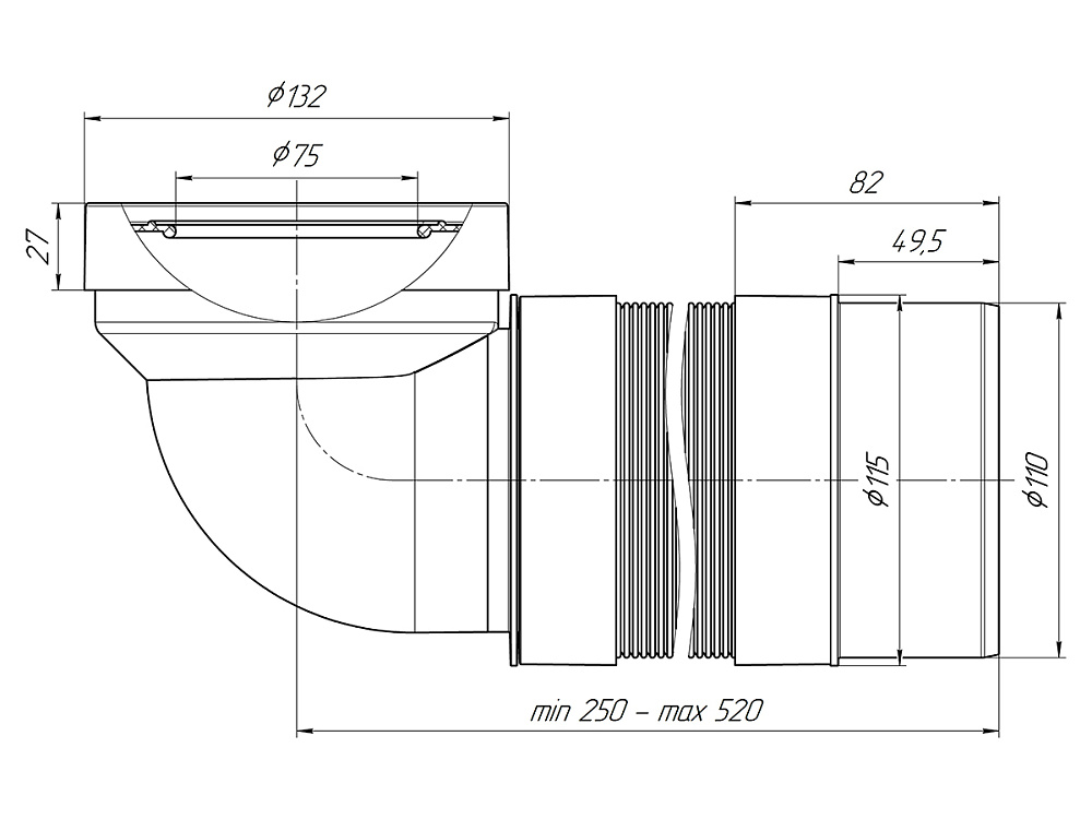 - Стандартный диаметр выпуска 110 мм гарантирует совместимость с пластиковыми канализационными системами.