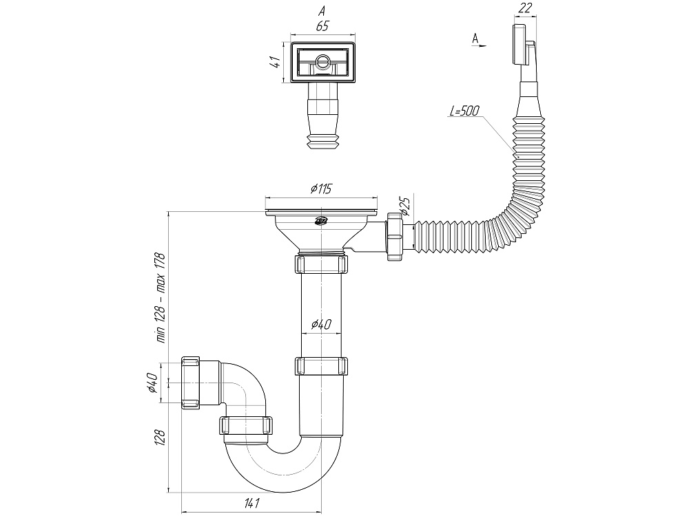 - Стандартные размеры делают сифон совместимым с большинством кухонных моек.