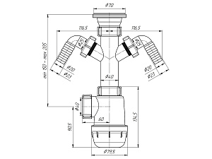 Сифон АНИ Пласт Грот A1100 — это оптимальное решение для современных кухонь, где требуется подключение сразу двух бытовых приборов. Благодаря двум отдельным отводам для стиральной и посудомоечной машины, вы сможете организовать слив максимально удобно и безопасно. Диаметр подключения 1 1/2 дюйма и труба 40 мм обеспечивают совместимость с большинством стандартных моек.