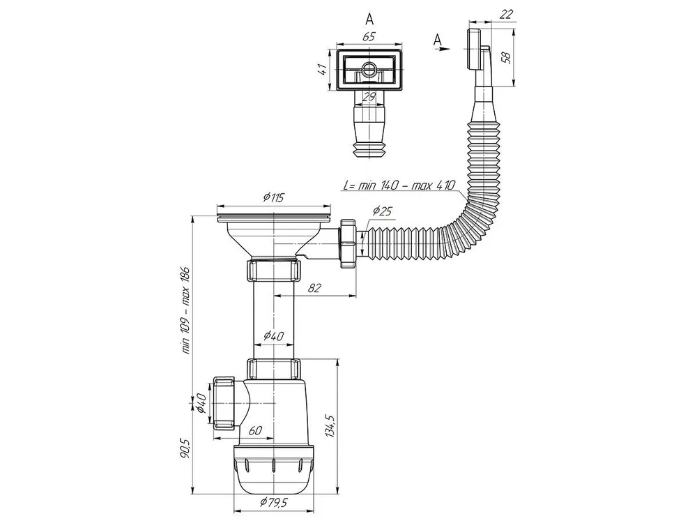 - Гибкий перелив предотвращает перелив воды и легко регулируется по длине.