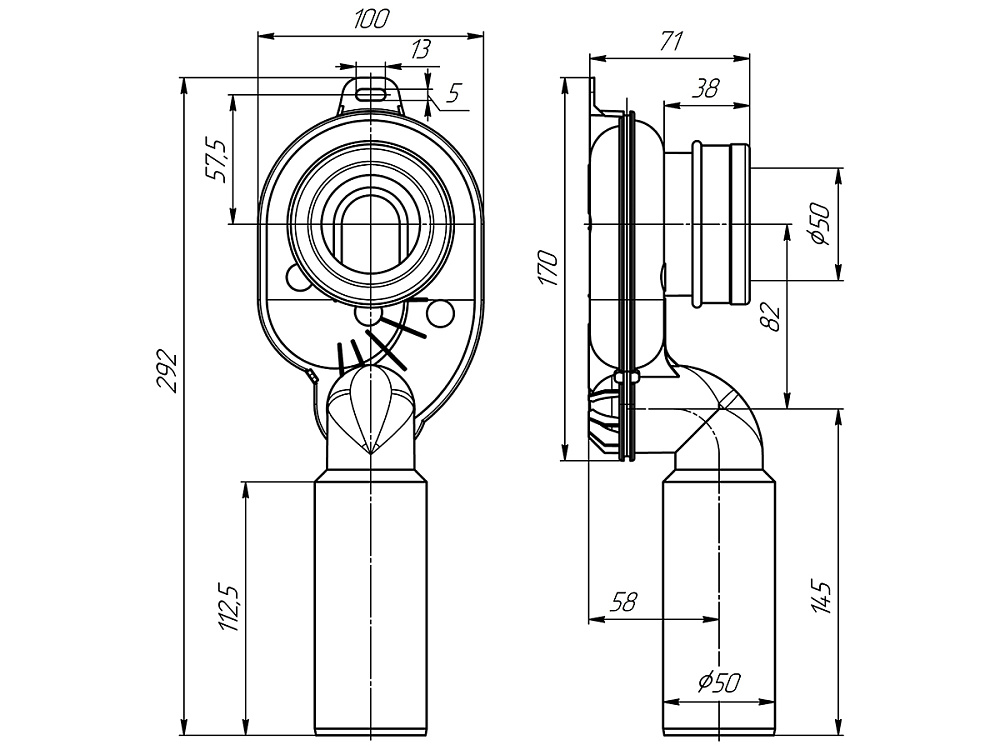 - Вертикальный выход 50 мм соответствует стандартным требованиям к канализационным системам.