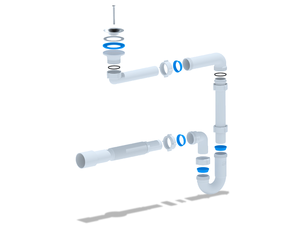 Регулируемый длинный горизонтальный патрубок позволяет сместить колено от сливного отверстия умывальника к стене, что освобождает пространство под умывальником и делает использование ванной комнаты более удобным.