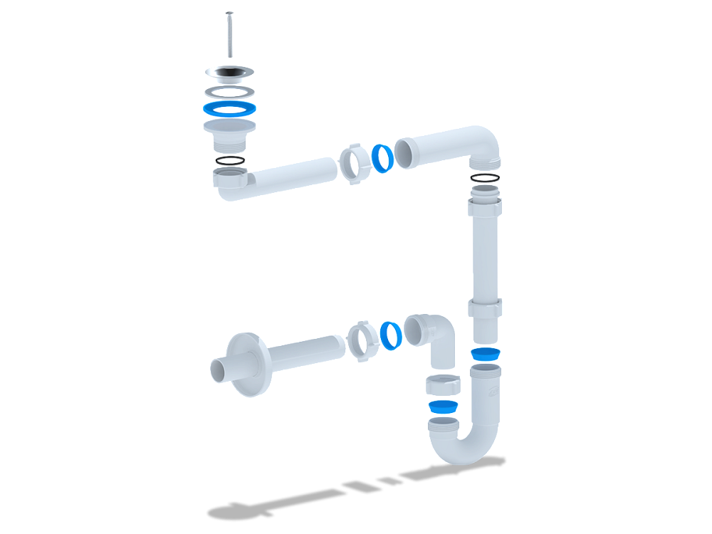 Регулируемый длинный горизонтальный патрубок позволяет сместить колено от сливного отверстия умывальника к стене, что освобождает пространство под умывальником и делает использование ванной комнаты более удобным.