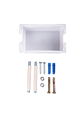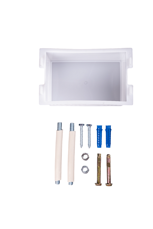 металлическая рама с нижними и верхними крепёжными элементами; пластмассовый смывной бачок в сборе; комплект переходных трубок; комплект крепления инсталляции; заглушка для трубы 50 мм; заглушка для трубы 110 мм; картонный короб; паспорт с инструкцией по монтажу и эксплуатации.