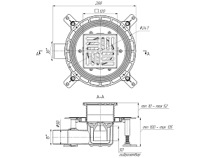 Трап горизонтальный регулируемый АНИ пласт THA5614 выпуск 50 мм с решеткой из нержавеющей стали 120х120 мм