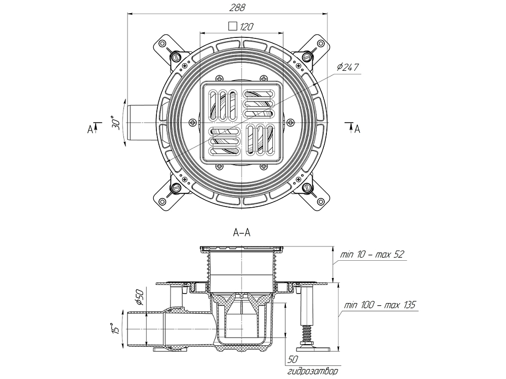 Трап для душа АНИ Пласт THA5614M — это горизонтальный точечный сливной трап с гидрозатвором, предназначенный для отвода воды из душевой комнаты в канализацию. Модель оснащена горизонтальным регулируемым выпуском из пластика диаметром 50 мм и прочной решёткой из нержавеющей стали размером 120×120 мм. Пропускная способность составляет 45 л/мин, высота гидрозатвора — 28 мм, минимальная монтажная высота — от 75 мм. Корпус выполнен из пластика с широкой юбкой диаметром 250 мм для надёжной фиксации гидроизоляции. Четыре опорные ноги с регулировкой высоты обеспечивают точный монтаж по уровню, а шарнирный выпуск облегчает регулировку наклона слива воды. Решётка выдерживает статическую нагрузку до 300 кг. Конструкция препятствует попаданию загрязняющих частиц в канализацию, предотвращает засоры и легко чистится.