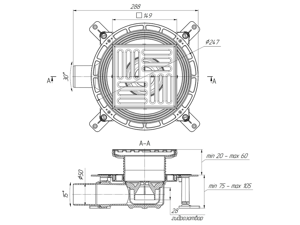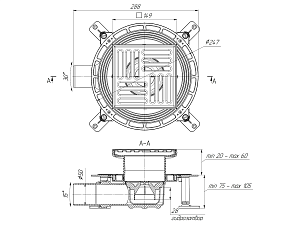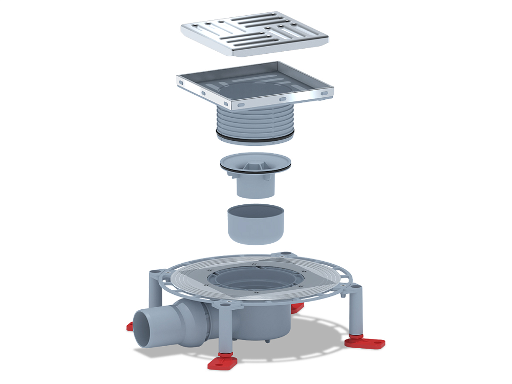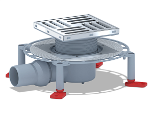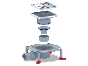 Трап для душа АНИ Пласт TVA5612 — это точечный сливной трап с гидрозатвором, предназначенный для отвода воды из душевой комнаты в канализацию. Модель оснащена горизонтальным регулируемым выпуском из пластика диаметром 50 мм и решёткой из нержавеющей стали размером 150×150 мм. Пропускная способность — 45 л/мин, высота гидрозатвора — 28 мм, минимальная монтажная высота — от 75 мм. Корпус выполнен из пластика с широкой юбкой диаметром 250 мм для надёжной фиксации гидроизоляции. Четыре опорные ноги с регулировкой высоты обеспечивают точный монтаж по уровню, а шарнирный выпуск облегчает регулировку наклона слива воды. Решётка выдерживает статическую нагрузку до 300 кг. Конструкция препятствует попаданию загрязняющих частиц в канализацию, предотвращает засоры и легко чистится.