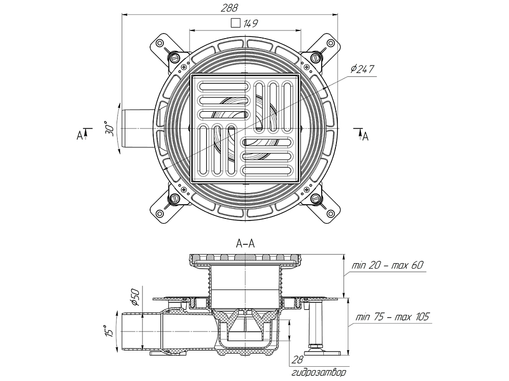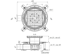 - Горизонтальный регулируемый трап для душа с гидрозатвором.