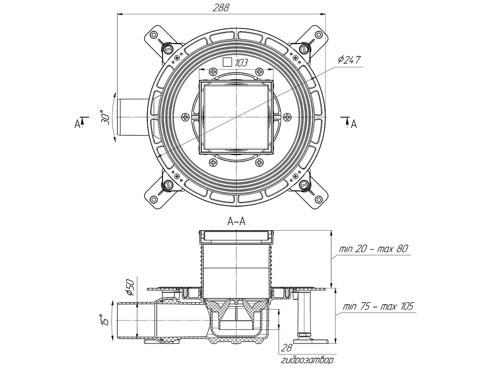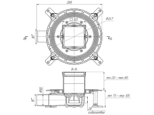 - Горизонтальный регулируемый трап для душа с гидрозатвором.