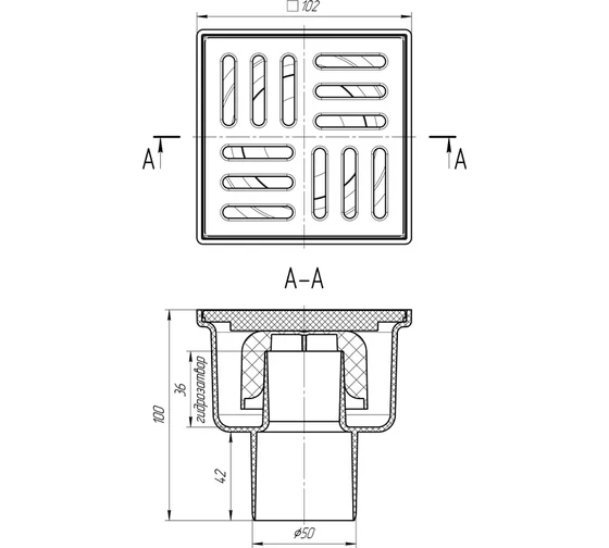 Трап вертикальный нерегулируемый АНИ пласт TA5204 выпуск 50 мм с решеткой из пластика 100х100 мм