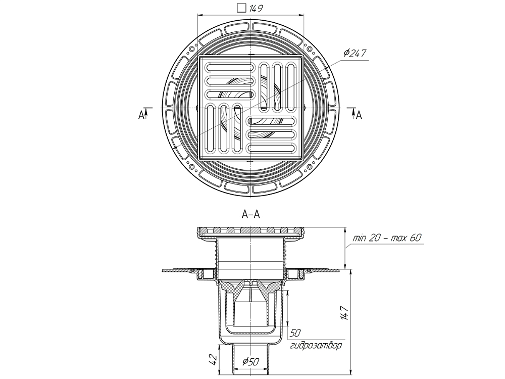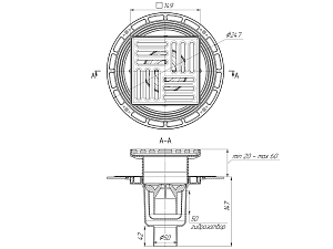 Трап вертикальный регулируемый АНИ пласт THA5716 выпуск 50 мм с решеткой из чугуна 150х150 мм